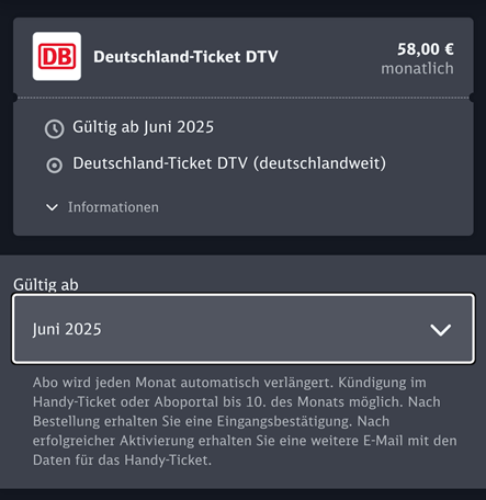 DB Navigator 앱 내에서 Deutschland-Ticket 선택Gültig ab : 시작하기를 원하는 '월' 을 고를 수 있습니다원하는 시작 '월' 선택 - 무조건 월 단위로만 선택 가능 예) 오늘 6월 5일부터 사용하고 싶으면 (6월) Juni 2025를 선택해야 합니다여기서는 실제 이용할 여행객(사용자) 정보를 입력하면 됩니다.