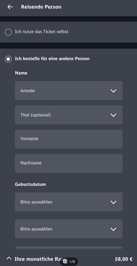 독일에 거주 중인 지인이 **티켓 구매 페이지(DB, BVG 등)**에서 ‘Ich bestelle für eine andere Person (다른 사람을 위한 주문)’ 옵션 선택